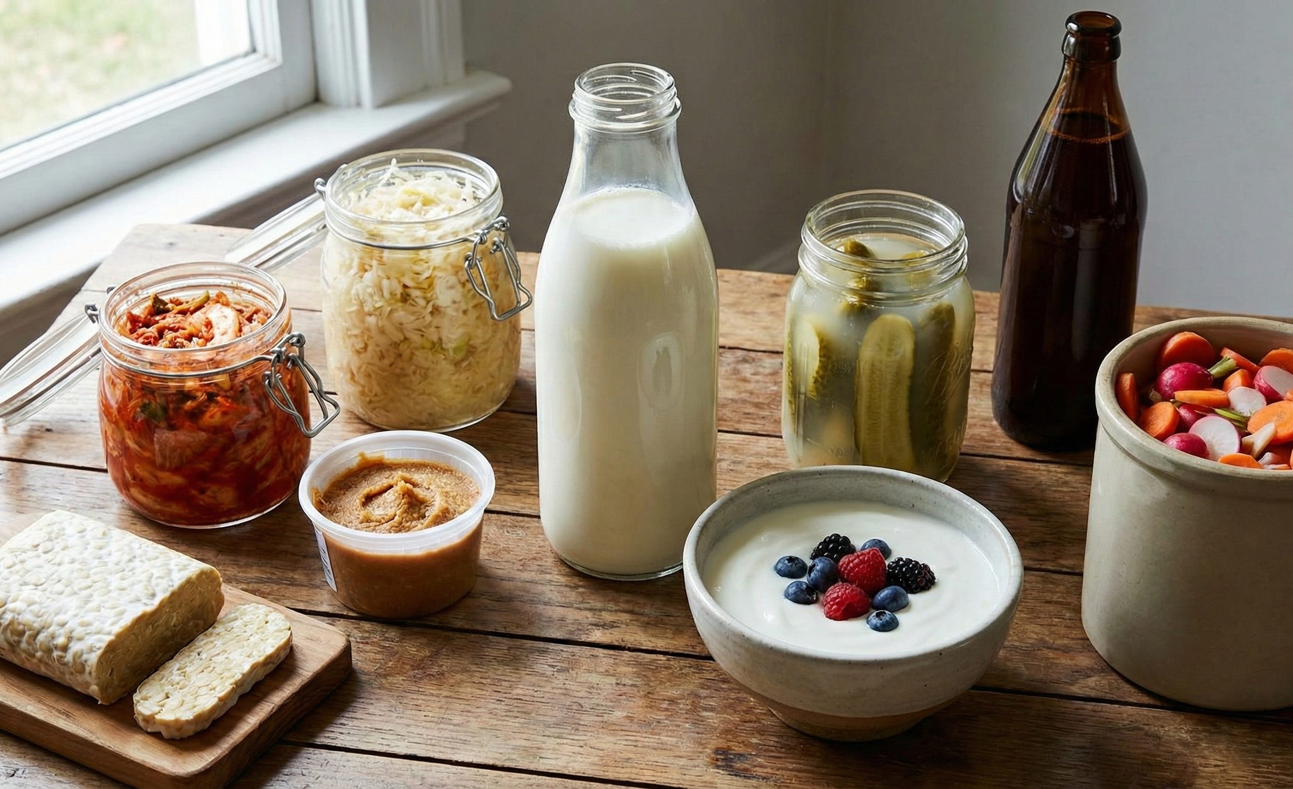 We’re talking kefir, sauerkraut, yogurt, kimchi, miso, tempeh, fermented pickles, kvass, and fermented veggies.
