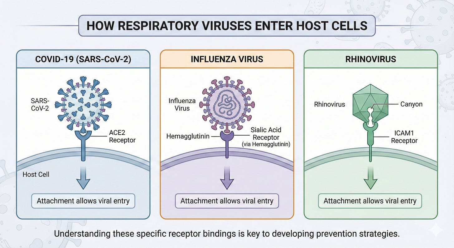 Step 1: The virus attaches to receptors and gains entry on the surface of cells in the mucous membranes. COVID-19 uses ACE2 receptors, influenza virus uses hemagglutinin, and rhinovirus binds to ICAM1 receptors. This attachment allows the virus to gain entry into the host cell.