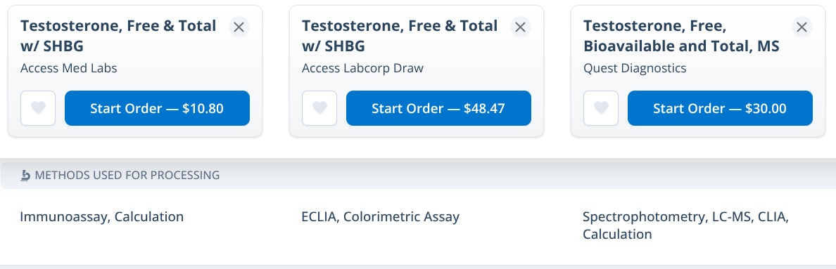 For the most accurate free testosterone we prefer the calculated method that requires the measurement of your total testosterone and SHBG. Look for the Vermeulen or TruTT calculation method on the lab test.