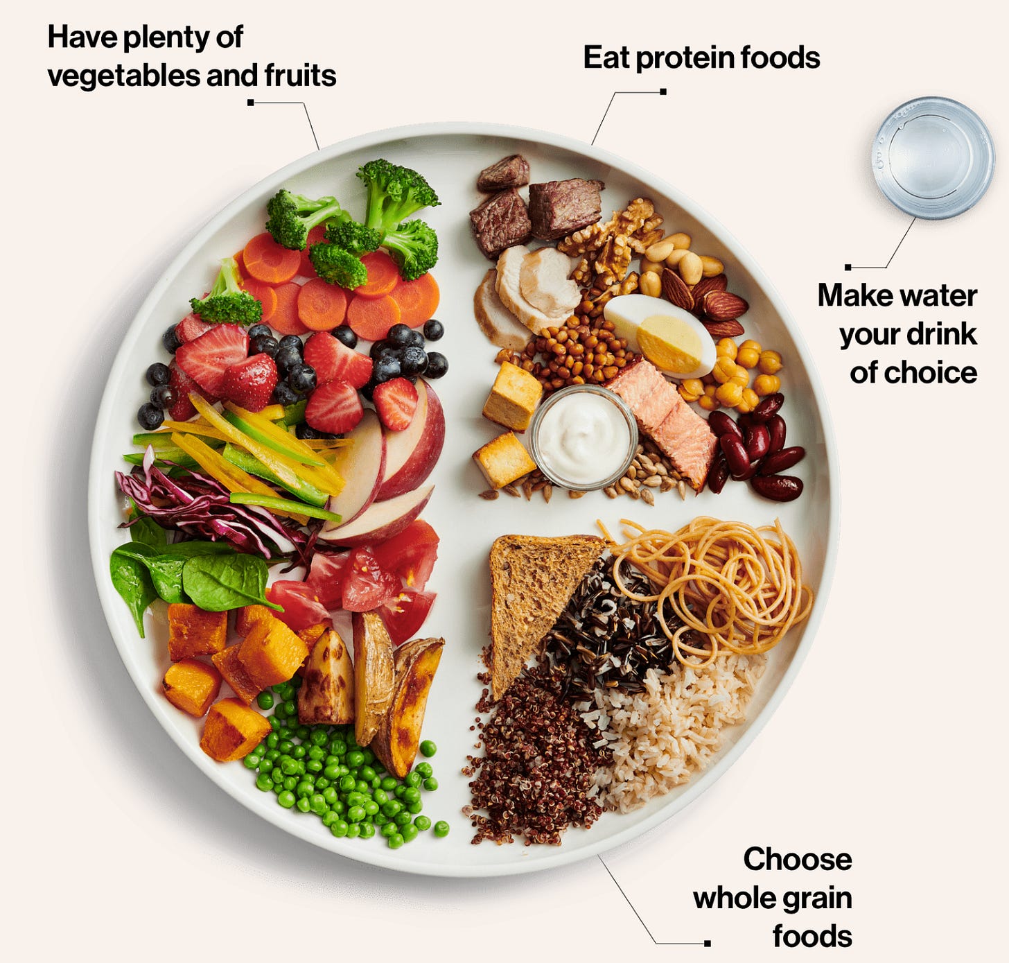 Consider: Think of your plate like this, about half should be grains, seeds, or vegetables. Add some colorful fruits, a portion of protein, and a small serving of dairy if it agrees with you.