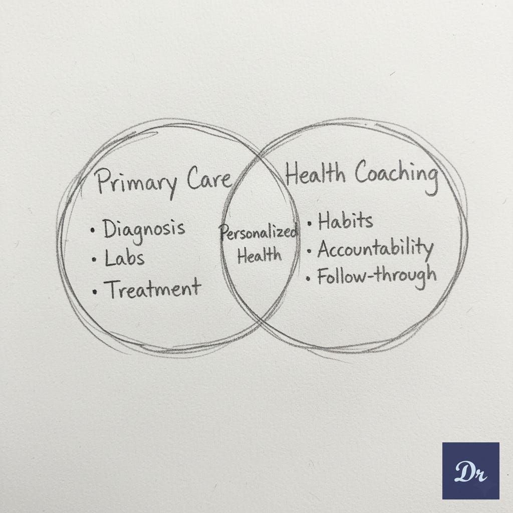 Most people don’t know the difference between a health coach and a primary care doctor. Here’s what each does best, and how I bridge both in my practice.
